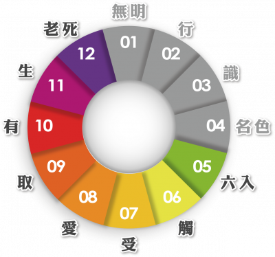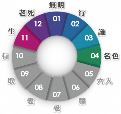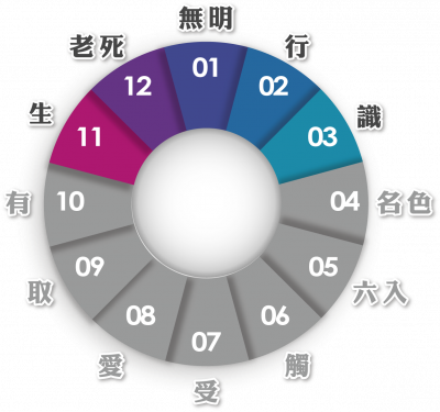 無明、行 → 識 → 名色 → [……] → 生 → 老病死憂悲惱苦
