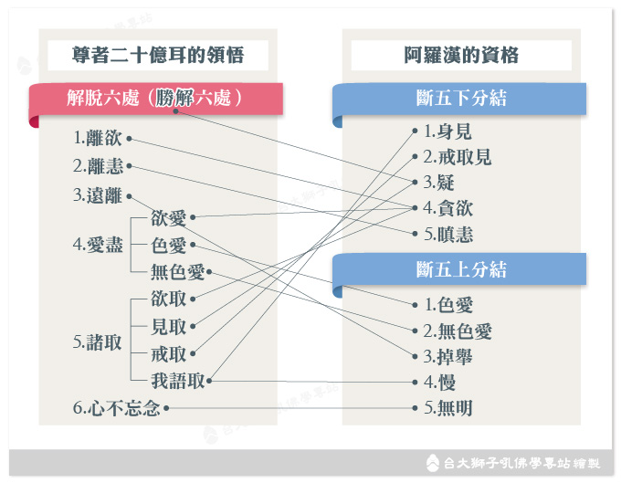 我們將尊者二十億耳領悟的解脫六處,和阿羅漢的資格作個比較,可發現如下連結:
