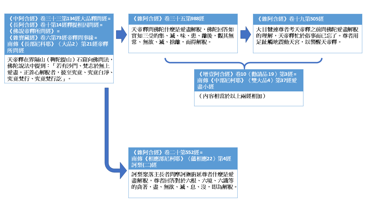 本經記載天帝釋於石窟中向釋迦牟尼佛請教,當中佛陀提到:「為愛所苦身得滅者,是為究竟、究竟梵行、究竟安隱、究竟無餘。」相當的《中阿含經》經文為:「若有沙門、梵志於無上愛盡,正善心解脫者,彼至究竟、究竟白淨、究竟梵行、究竟梵行訖。」 基於這句話,日後天帝釋向佛陀進一步詢問什麼是「愛盡解脫」,該段對話又引生後續的問答及事件,算是橫跨四部阿含、尼柯耶,傳誦天上與人間的問答接龍。這些經載彼此間的關係如下圖所示: [進階辨正] |