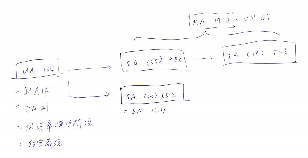 chakwos: 在讀今天的讀經班進度時發現,《中阿含經》卷三十三第134經大品釋問經好像是這一切的開始,當中天帝釋在鞞陀提山(界隔山)石窟向佛問法,佛陀說法中提到:「若有沙門、梵志於無上愛盡,正善心解脫者,彼至究竟、究竟白淨、究竟梵行、究竟梵行訖」。 root: 我查到大正藏還有一部《佛說帝釋所問經》也是中阿含第134經的異譯。 David Chiou: 感謝各位同學的分享及討論,關於天帝釋在界隔山石窟問愛盡解脫之義的相關經典,終於串起來了: 《中阿含經》卷三十三第134經大品釋問經等經記載天帝釋於石窟中向釋迦牟尼佛請教,當中佛陀提到:「若有沙門、梵志於無上愛盡,正善心解脫者,彼至究竟、究竟白淨、究竟梵行、究竟梵行訖。」這一經長又複雜,所以大多讀經的人可能看到這段話之前已經花掉了,仔細讀到這句話的人,也不見得會聯想到這句話就是後來被引述多次的「愛盡解脫」的出處,因此實在不好找呀! 基於這句話,後來天帝釋向佛陀進一步詢問什麼是「愛盡解脫」,該段對話又引生後續的問答及事件,算是橫跨四部阿含、尼柯耶,傳誦天上與人間的問答接龍。這些經載彼此間的關係如下圖所示: 以下為較詳細的說明,每個框框之中,上面為經號及經名,下面為該經內容簡介: David Chiou: 除了四阿含及尼柯耶外,原來《中阿含經》第134經在大正藏有好幾個翻譯,root 找出了《佛說帝釋所問經》,我也找到《雜寶藏經》卷六第73經帝釋問事緣,都是本經的另譯,這些譯本是目前四阿含對應經典列表上還未列出的。「天帝釋問佛愛盡解脫之義」這幾經彼此的關係,以前也沒見過探討,要感謝 Melon 及 chakwos 的分享,三個臭皮匠勝過一個諸葛亮,謝謝大家方便未來讀經的同學們。