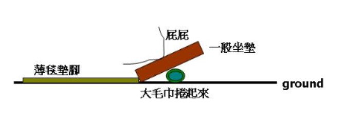 如果地不會特別冰或特別潮,或是地上已有隔離的東西或木地板,用大的方型軟墊即可,較便宜。否則方型椰纖墊很厚,能好好隔離地面。我的方型椰纖墊用了二十幾年,蠻耐用的。 如果雙盤時只有一膝能著地,一則就是將蒲團再加高些試試是否能二膝著地,二則是在懸空的膝蓋下以毛巾墊著,這樣才能讓兩個膝蓋都分擔身體的重量。 Li boris: 如果褲子布料較平滑,由於椰絲墊跟褲子所形成的摩擦力不夠大,坐在有斜面的椰墊上有時候會有滑動的情況,可以換穿摩擦係數大的褲子,或者在椰墊上鋪一塊大毯子增加摩擦力,就不會有滑動的情況。 guest: 沒想到這二次禪二,我發現左腿盤不起來,在第二次禪二時硬盤的結果是大腿一直抽筋,站不起來... David Chiou: 打坐的障礙要一個一個解決,很正常,別擔心。這次知道問題,就想解法即可。 體格較壯的人,蒲團高一些或壂兩個,可能比較符合人體工學。 如果沒法盤腿,大不了坐椅子打坐也可。 Anderson Chang: 對於骨架結構不是很正的同學而言,蒲團的高度跟平面的硬度都得注意。首先不能太低,硬度方面不建議是早期那種用久會塌陷變很軟木棉棉花一類的填充材質,會讓骨盆及股骨相對位置越坐越往錯誤的方向旋轉,筋膜系統也隨之更形緊繃,超過疼痛的閾值上限,就會痛不欲生、一刻都坐不下去了⋯⋯ 後來用椰子絲🥥、泡棉,或其他密度較高物質當填充物的,坐骨接觸面比較好維持一個整體的平面高度。 這樣對骨架結構以及坐的時間都會有助益。 Philosopher: 不曉得用瑜伽墊適不適合? boris: 可以試試下圖的方式看看是否有改善。我因為練球關係,四肢跟腰部都有舊傷,即使有座墊墊高也會覺得腰部有點吃力,腳也容易麻,後來自己亂試,試到這種方式,一舉把腰部支撐與腳麻問題解決,坐上去後覺得好舒服,這方法好處是可以移動捲起來大毛巾的位置來調整坐墊斜度,我是用硬的坐墊,不會陷下去那種。後來我把捲起來的大毛巾改成用另一個硬座墊去當支撐點,效果一樣好。另外可在鞋的坐墊上鋪上另一條大毛巾增加摩擦係數,褲子不要穿光滑摩擦係數小的材質,這樣就不會有滑動的情況。 Anderson: