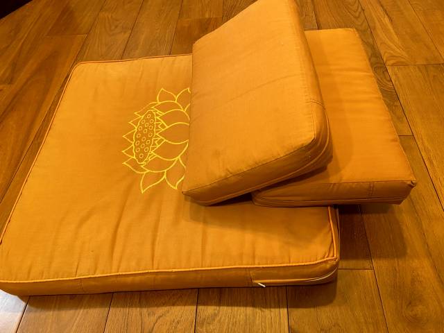 木棉蒲團(可用手捏為一側較扁、一側較高,坐在較扁的那側;或是坐久了自然會如此):