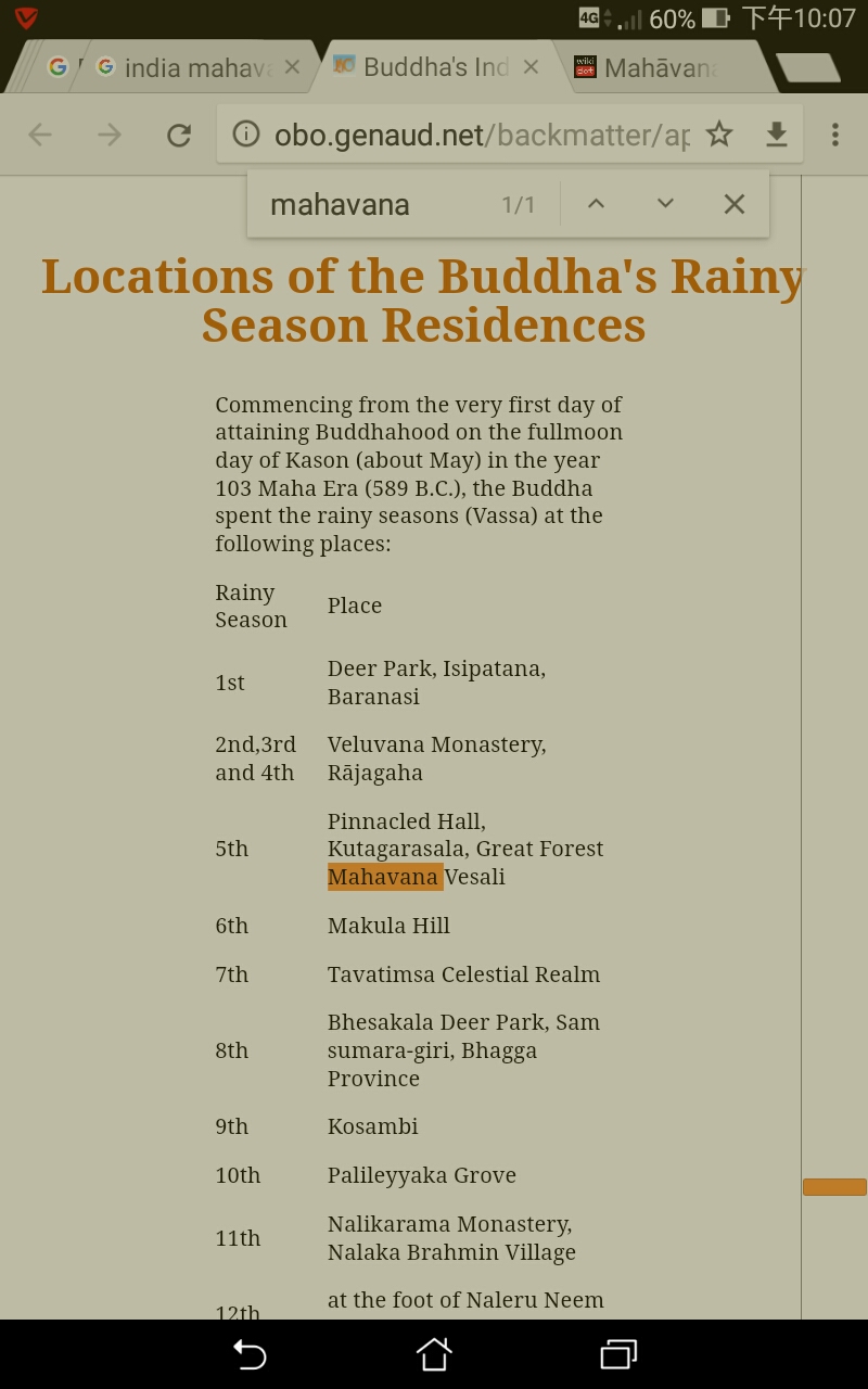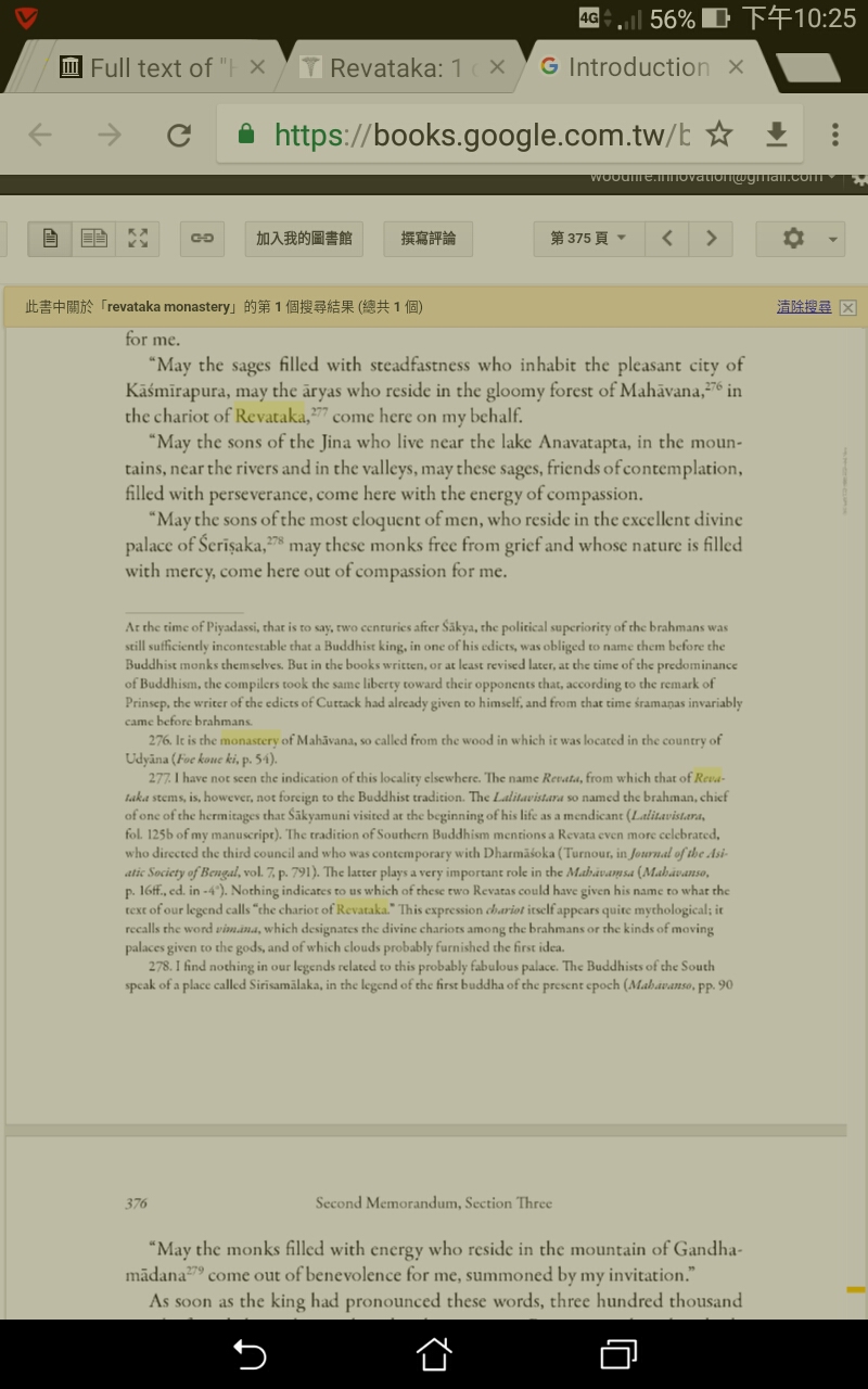 諸聖在處處, 罽賓🄽㋐多波婆🄾㋑ 老外的資料略有出入,但顯然不是寺院就是地名。 大林mahavana 跟revataka 應該是兩個不同的地方。 我再繼續找找看。 David Chiou: 謝謝! 大林精舍很常見,就是重閣講堂。不過我也不確定是不是這邊的大林就是指大林精舍,因為大林本身也能指很大的林,而且大林精舍的地點(在中印度)離北印罽賓有一段距離,因此只能註解為「可能為大林精舍」了。 Anderson Chang: 第一位老外認為,阿育王無遮大會邀請的是「四方」僧,故用all quarter這個詞。
