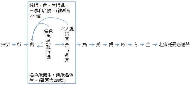 guest: 《雜阿含經》卷十一第273經:「緣眼、色,生眼識,三事和合觸,觸俱生受、想、思」,這個過程要怎麼對應到十二因緣呢? 「想、思」屬於「名色」,但將「想、思」擺到名色支的話,「觸俱生受想思」是第6支生第4支,和十二因緣的順序兜不起來,不只相反,而且有跳次序? David Chiou: 可參考這張圖: 「觸俱生受、想、思」的「受想思」的「受」是第7支,「想」對造業是較間接的影響,因此沒直接單獨列作十二因緣的一支(雖然理論上名色也包含了想,如您所說經文義理上沒有這對應關係,否則會相反了且跳次序),「思」則是一種行陰,行陰在十二因緣中是以直接影響造業的第8、9(愛、取)兩支來作例子。 因為十二因緣是強調有無明而造業,造成生死流轉的因緣關係,因此拿「觸俱生受、想、思」的經文較不是直接對應,而是以《雜阿含經》卷八第221經這樣的說法:「緣眼、色,生眼識,三事和合觸,觸緣受,受緣愛,愛緣取」(CBETA, T02, no. 99, p. 55, a19-20) 比較適合直接擺進十二因緣的過程中比對。 其它可參考卷十二第294經的讀經拾得。 |