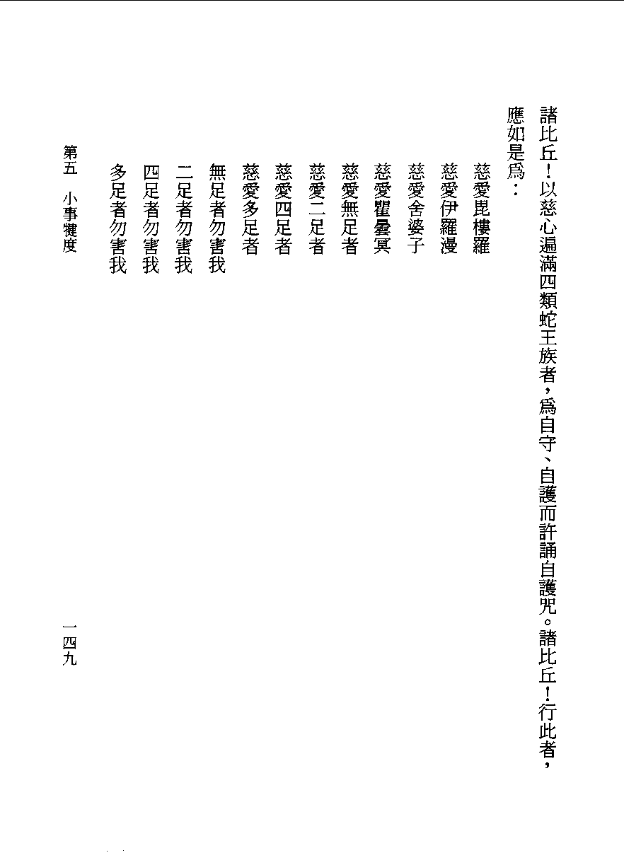 棄養之後造成很大的生態問題。之前和美洲鱷相吞的事就很出名。 至於其他省份就不用說了,基本上出了仰光五十里就是100前的台灣,更鄉下一點的省份還要落後200年。自然環境配合之下,即使是外國人最喜歡去的觀光勝地Bagan。當地人也說天黑後千萬不要踏上草地,毒蛇很多。我在飯店草坪也親眼看到蛇攻進來捕食青蛙。 我是沒聽過有人念誦蛇護咒,當然我沒有特地向當地僧俗四眾探問這件事,參觀的地方也不夠多,見聞不足作為參考。 有看過三個做法: 第一在佛寺建築相當於「燕尾脊」的部位做上龍頭,在門口樹立龍王塑像,或是在某些特別多的地區直接以偏殿祭拜(如前述仰光郊區的naga mountain一座寺院就有這樣的設置),可能想說拜了蛇王會保庇。 第二,某些禪修道場是教人修慈心觀,例如帕奧禪林。其文本就是大家應該都聽過的慈經Metta Sutta。 第三,實戰故事。我的朋友,一位熱衷佛教的醫生,幾年前以軍醫身分被派到泰緬邊境跟少數民族打仗,有看過藍波四吧,那裡真的是人間地獄,在叢林裡天天都有人被游擊隊摸掉頭,他們在叢林中根本沒有營舍,都直接睡在樹下,而這位醫生就在一條大蟒蛇下睡了九個月,(沒辦法,因為他們部隊基本上算是被包圍住) 我問他怎麼跟一條大蟒共處九個月? 他說他無時無刻都在對它念誦 世尊十種功德,他認為蟒蛇可以藉由他分享的功德得到益處。我想這某一程度代表了南傳教徒的看法。 作者: Link From: DavidChiou 對蛇的護咒這一直是個難搞的問題,從民國初年學者以為南傳沒有,到宋澤萊攻擊時的立論,到近年南傳律藏中譯本讓我們發現原來南傳是收錄於律藏中,以及實際到南傳國家實際了解南傳佛教,發現南傳其實是有咒願的,只是不將咒願視為真理或無上大法。 From: Heaven Chou 是的, 南傳的版本是有咒願, 也就是經中如下的偈誦. 常慈念於彼 堅固賴吒羅 慈伊羅槃那 尸婆弗多羅 欽婆羅上馬 亦慈迦拘吒 及彼黑瞿曇 難徒跋難陀 慈悲於無足 及以二足者 四足與多足 亦悉起慈悲 慈悲於諸龍 依於水陸者 慈一切眾生 有量及無量 但咒術章句那一段則是南傳所無, 所以才說當時否真有說此咒, 還無法判斷. From: DavidChiou 那咒術章句是不是偈誦內容的原文音譯?後來我發現這在南傳也常見,基於對佛法傳承的遵重,同一偈誦有二種版本的翻譯或傳承,一種是原始發音,一種是南傳當地文字的翻譯。在日本從中國翻過去的偈誦更厲害,有日文版、日文拼中文發音版、日文拼梵文發音版。 至於上面提到的同樣偈誦的二種版本(音譯和義譯各一),個人的理解是「防護咒」或「咒願」很多都是祈請三寶護法龍天加護,以防範或對治惡鬼神或外道的干擾。因此當初的譯經師可能也有點困擾:我用外國話,佛教護法聽得懂嗎?因此乾脆義譯一次、音譯一次。中土譯經到後來因此有了「五不翻」的作法。若就原理上,心念最重要,用音譯或義譯理論上都可以,畢竟天人不說英文、不說中文、不說巴利文,而是以心念溝通。 From: Heaven Chou David說的 “原文音譯” , 我原本也想過, 但看它那麼短, 就不認為如此. 或許真的就是其中某一段偈頌的音譯, 有機會再來找看看是哪一段. 或著有精通巴文文的法友, 代為查看看律藏小事犍度中的 “六 對蛇之護咒” , 當中的偈誦哪一句是北傳此咒: 『塢躭婆隸 躭婆隸 躭陸 波婆躭陸 㮈渧 肅㮈渧 抧跋渧 文那移 三摩移 檀諦尼羅抧施 婆羅拘閇塢隸 塢娛隸 悉波呵』 From: Avery Chan 薩婆訶是玄奘所譯, 即是”悉波呵”, 玄奘前的譯法吧, =svāhā, 此字在梵文經裡常有, 通常又放到尾尾的。巴利經裡與此字差不多的是Svāhaṃ=Sohaṃ=so ahaṃ=我, so用來加強語氣, 如itipi so bhagava.... 梵語svāhā或svāha, 通常用於咒語的結束。但是這樣的結構, 巴利經是沒有的。它的拆法是so āhā, “āhā”是”is”變格, 忘了是什麼啦, 也不想找筆記。直譯是那就是這樣, 有完結, 終結, 究竟的意思在。 From: DavidChiou Heaven, 你提到的長度的問題,我也不清楚。此咒的偈誦(即「諦語」)在律中多次出現,有的偈誦較短,不知是否兜得上? 例如《五分律》:「八種蛇者。提樓賴吒蛇。怛車蛇。伊羅漫蛇。舍婆子蛇。甘摩羅阿濕波羅呵蛇。毘樓羅阿叉蛇。瞿曇蛇。難陀跋難陀蛇。呪蛇者。我慈諸龍王,天上及世間,以我此慈心,得滅諸恚毒。我以智慧力,用之殺此毒,味毒無味毒,破滅入地去。」 《四分律》的就較長:「佛聽作自護慈念呪。毘樓勒叉慈。伽寧慈。瞿曇冥慈。施婆彌多羅慈。多奢伊羅摩尼慈。伽毘羅濕波羅慈。提頭賴吒慈。慈念諸龍王乾闥婆羅剎娑。今我作慈心。除滅諸毒惡。從是得平復。斷毒滅毒除毒。南無婆伽婆。」 《根本說一切有部毗奈耶》的經文則跟《雜阿含經》的意義幾乎一樣,也有咒術章句:「怛姪他 菴 敦鼻麗敦鼻麗 敦薜 鉢利敦薜 [木*奈]帝蘇[木*奈]帝 雞[木*奈]帝 牟柰裔 蘇牟柰裔 彈帝尼攞雞世 遮盧計薜 嗢毘盈具麗莎訶」。之後還有解說優波先那比丘的宿業,前世的惡業造成他多世以來都是中毒而亡。 《佛說隨勇尊者經》卷1:「爾時,世尊說大明曰: 「怛[寧*也](切身)佗(一句) 唵(引)凍蜜里(引)(二) 凍蜜里(引)(三) 凍彌(引)(四) 鉢囉(二合)凍彌(引)(五) 那致(引)(六) 蘇那致(引)(七) 計(引)嚩致(引)(八) 母那曳(引)(九) 薩三摩曳(引)(十) 難帝(引)(十一) 難底里(引)(十二) 泥(引)里(引)(十三) 泥(引)羅計(引)尸(引)(十四) 嚩(引)里(引)(十五) 嚩(