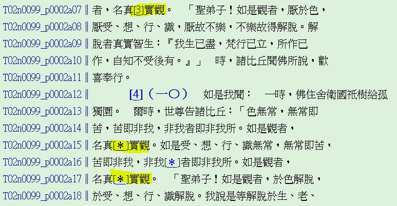 Pohchee Lim: 《雜阿含經》第203經的校勘 5. PDF pg.338 校勘v v 「座」,大正藏原為「坐」,今依據宋、元、明三本改作「座」。* * 是否源自 209经 倒数第二行? David Chiou: 我大概知道 Pohchee 的意思了。 有*號代表這個校勘會再次出現,屆時就以*指出來。 但第203經該頁沒有其餘的「座」字,一直到幾頁之後的第209經才再次出現「座」字: Pohchee 指出的是:「在大正藏因為一頁有非常多字,第203經、209經可能是在同一頁,因此校勘是這麼寫。在《好讀 雜阿含經》則第203經、第209經,已跨了很多頁,還是用這樣的*標示嗎?還是第203經作一次『座』的校勘標示、第209經再作一次『座』的校勘標示?」 我覺得都可以,畢竟真得那麼細心的讀者應該會看得懂。理論上不同頁再作一次校勘標示會更清楚,但這樣美編就更累了,因此要由Melon決定。 Melon Lien: 大家好, 星號的標示規則若要現在變更, 那麼對文編、美編、校對而言,都是不小的工程, 還請文編討論後決定, 若有任何變更請一併標示在PDF檔上, 我就照著修改即可。 謝謝。 melon David Chiou: 我請教 CBETA Heaven 大正藏在此點的規則:「好像不是單純以經或頁為單位。請問是不是以卷為單位,同卷已出現過的就不再標*?」 以下是 Heaven 的回覆: 其實大正藏星號的範圍, 我們也不確定, 以下圖為例, 那個 “實” 字的校勘是跨越了第九經與第十經. 在過去的經驗中, 有時它是在同一頁, 有時會跨頁. 記得過去有試著找規則, 但好像在同一卷但隔了幾頁, 就重新另立校勘, 而不是用星號. 或是跨卷了, 但在同一頁, 所以依然用星號. 我想這是因為書本編輯是依當時的方便吧, 因此沒有完全一致的規範. 至於我們自己編的書, 就看是不是要調整成一致的規則. heaven David Chiou: 看來真的要完全一板一眼,實在是太複雜且費時了,大正藏本身就沒有完全嚴謹的規則。 我們以讀者能理解為最高原則,決定不花費太多時間重新一頁頁修改校勘,因此不改內文校勘的*,只在「本書使用方法」的部分,將「校勘」的說明略改為如下: