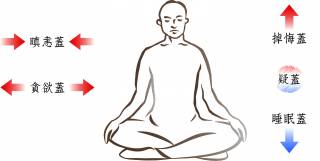 五蓋會阻礙入定,也阻礙證悟。為方便在實修中檢視並對治五蓋,要熟記五蓋的項目及意義,也可參考右圖以幫助記憶。 (九二六)[0235c27]如是我聞: 一時,佛住那梨聚落①深谷精舍ⓐ。 爾時,世尊告詵陀ⓑ迦旃延:「當修真實禪②,莫習強良ⓒ禪ⓓ③,如強良馬④,繫槽櫪上,彼馬不念:『我所應作、所不應作。』但念穀草。如是,丈夫於貪欲纏多所ⓔ修習故,彼以貪欲心思惟ⓕ,於出離道⑤不如實知,心常馳騁,隨貪欲纏而求正受;瞋恚、睡眠、掉悔、疑多修習故,於出離道不如實知,以疑蓋心思惟,以求正受。 「詵陀!若真生馬⑥繫槽櫪上,不念水草,但作是念:『駕乘之事。』如是,出離五蓋,才有正受丈夫不念貪欲纏,住於出離如實知,不以貪欲纏而求正受,亦不瞋恚、睡眠、掉悔、疑纏,多住於出離;瞋恚、睡眠、掉悔、疑纏如實知,不以疑纏而求正受。 「如是,詵陀!比丘如是禪者,不依地修禪⑦,不依水、火、風、空、識、無所有、非想非非想而修禪。不依此世、不依他世,非日、月,非見、聞、覺、識⑧,非得非求,非隨覺,非隨觀而修禪⑨。 「詵陀!比丘如是修禪者,諸天主、伊濕波羅⑩、波闍波提⑪ⓖ恭敬合掌,稽首⑫作禮而說偈言: