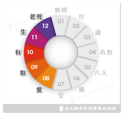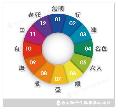 此經中說的三觀,可解為陰、界、入,是佛經中常用的對於一切事物的三種不同的分類法、或三種不同的觀察切入角度。舉例來說,《般若波羅蜜多心經》:「是故,空中無色,無受、想、行、識(空五陰);無眼、耳、鼻、舌、身、意(空內六入處);無色、聲、香、味、觸、法(空外六入處);無眼界,乃至無意識界(空十八界)」(CBETA, T08, no. 251, p. 848, c11-13)。 [進階辨正](四三)[0010c19]如是我聞: 一時,佛住舍衛國祇樹給孤獨園。 爾時,世尊告諸比丘:「取故生著,不取則不著。諦聽,善思,當為汝說。」 比丘白佛:「唯然,受教。」 於五陰有我見,取著,心就會隨五陰轉佛告比丘:「云何取故生著?愚癡無聞凡夫於色見是我、異我、相在,見色是我、我所而取;取已,彼色若變、若異,心亦隨轉①;心隨轉已,亦生取著②攝受心住③;攝受心住故,則生恐怖、障礙、心亂,以取著故。愚癡無聞凡夫於受、想、行、識,見我、異我、相在,見識是我、我所而取;取已,彼識若變、若異,彼心隨轉;心隨轉故,則生取著攝受心住;住已,則生恐怖、障礙、心亂,以取著故,是名取著。 見五陰無我,不取著,心就不隨五陰轉「云何名不取不ⓐ著?多聞聖弟子於色不見我、異我、相在,於色不見我、我所而取;不見我、我所而取已ⓑ,彼色若變、若異,心不隨轉;心不隨轉故,不生取著攝受心住;不攝受住故,則不生恐怖、障礙、心亂,不取著故。如是受、想、行、識,不見我、異我、相在,不見我、我所而取。彼識若變、若異,心不隨轉;心不隨轉故,不取著攝受心住;不攝受心住故,心不恐怖、障礙、心亂,以不取著故,是名不取著ⓒ。是名取著、不取著。」 佛說此經已,諸比丘聞佛所說,歡喜奉行。 [校勘]ⓐ 宋、元、明三本無「不」字。 ⓑ 「已」,大正藏原為「色」,今依據宋、元、明三本改作「已」。 ⓒ 元、明二本無「是名不取著」五字。 [註解]① 隨轉:被牽著走。 ② 取著:執取;執著。 ③ 攝受心住:持續地攝住心;心持續地被把持住。「住」是持續、穩固的意思。 [對應經典][讀經拾得]見五陰無我,不取著,就能「心不隨境轉」。 (四四)[0011a13]如是我聞: 一時,佛住舍衛國祇樹給孤獨園。 爾時,世尊告諸比丘:「若生則繫著,不生則不繫著。諦聽,善思,當為汝說。 「云何若生則繫著?愚癡無聞凡夫於色集、色滅、色味、色患、色離不如實知故,於色愛[*]喜、讚歎、取著,於色是我、我所而取;取已,彼色若變、若異,心隨變異;心隨變異故,則攝受心住,攝受心住故,則生恐怖、障礙、顧念,以生繫著故。受、想、行、識亦復如是。是名生繫著。 「云何不生不繫著?多聞聖弟子色集、色滅、色味、色患、色離如實知。如實知故,不[*]愛喜、讚歎、取著,不繫我、我所而取;以不取故,彼色若變、若異,心不隨變異;心不隨變異故,心不繫著攝受心住;不攝受心住故,心不恐怖、障礙、顧念,以不生不著故。受、想、行、識亦復如是。是名不生不繫著。」 佛說此經已,諸比丘聞佛所說,歡喜奉行。 [對應經典][讀經拾得]本經說「若生則繫著」,是指生了什麼? 可見前一經(第43經)所說「取故生著」,可以指有「取」,也就是「於色集、色滅、色味、色患、色離不如實知故,於色愛喜、讚歎、取著,於色是我、我所而取」,所以生繫著。 [進階辨正][導讀:十二因緣]苦的生起(「苦集」)簡言之就是貪愛、執著造成的。若作更細部的解析,可分解為十二因緣: 無明緣行、行緣識、識緣名色、名色緣六入處、六入處緣觸、觸緣受、受緣愛、愛緣取、取緣有、有緣生、生緣老病死憂悲惱苦。 「緣」表示前者是後者的條件。這當中緣生的十二支為: (1) 無明 → (2) 行 → (3) 識 → (4) 名色 → (5) 六入處 → (6) 觸 → (7) 受 → (8) 愛 → (9) 取 → (10) 有 → (11) 生 → (12) 老病死憂悲惱苦 前面的第 39 經最少提到了 (3)~(4) 支,第 41 經則提到了 (3)~(8)。 以下第 45 經提到了 (4)~(7) 支,第 57 經提到了 (5)~(8) 支,第 53 經則提到了 (8)~(12) 支。為了能瞭解接下來的各經文,讓我們先看看 (4)~(12) 支是什麼: