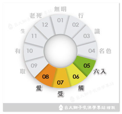 稱作「六受身」,這裡的「身」是指「種類」,也就是有六種感受。 這裡的「觸」特指感官、外境、識,三者接觸,因此上面的六受身可詳述為: