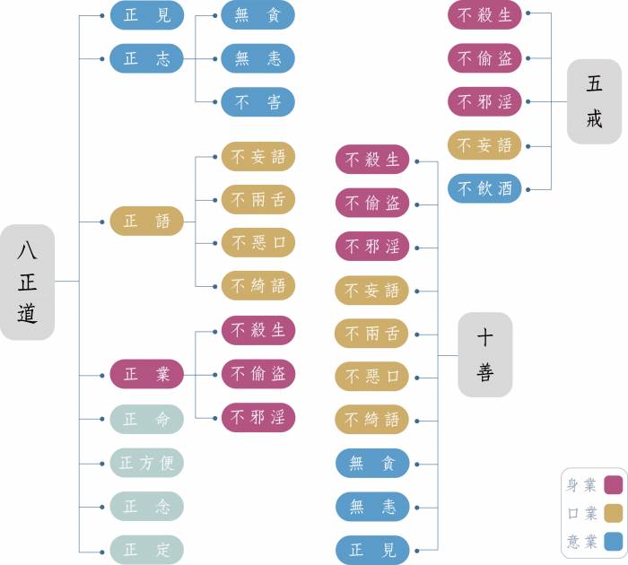 十善或十惡中,前三個是屬於身業,接著的四個是屬於口業,最後三個是屬於意業。身、口、意三業清淨,修行才能有所成就。 (七九一)[0205a10]如是我聞: 一時,佛住舍衛國祇樹給孤獨園。 爾時,世尊告諸比丘:「有邪、有邪道,有正、有正道。諦聽,善思,當為汝說。何等為邪?謂地獄、畜生、餓鬼。何等為邪道?謂殺、盜、邪婬、妄語、兩舌、惡口、綺語、貪、恚、邪見。何等為正?謂人、天、涅槃。何等為正道?謂不殺、不盜、不邪婬、不妄語、不兩舌、不惡口、不綺語、無貪、無恚、正見。」 佛說此經已,諸比丘聞佛所說,歡喜奉行。