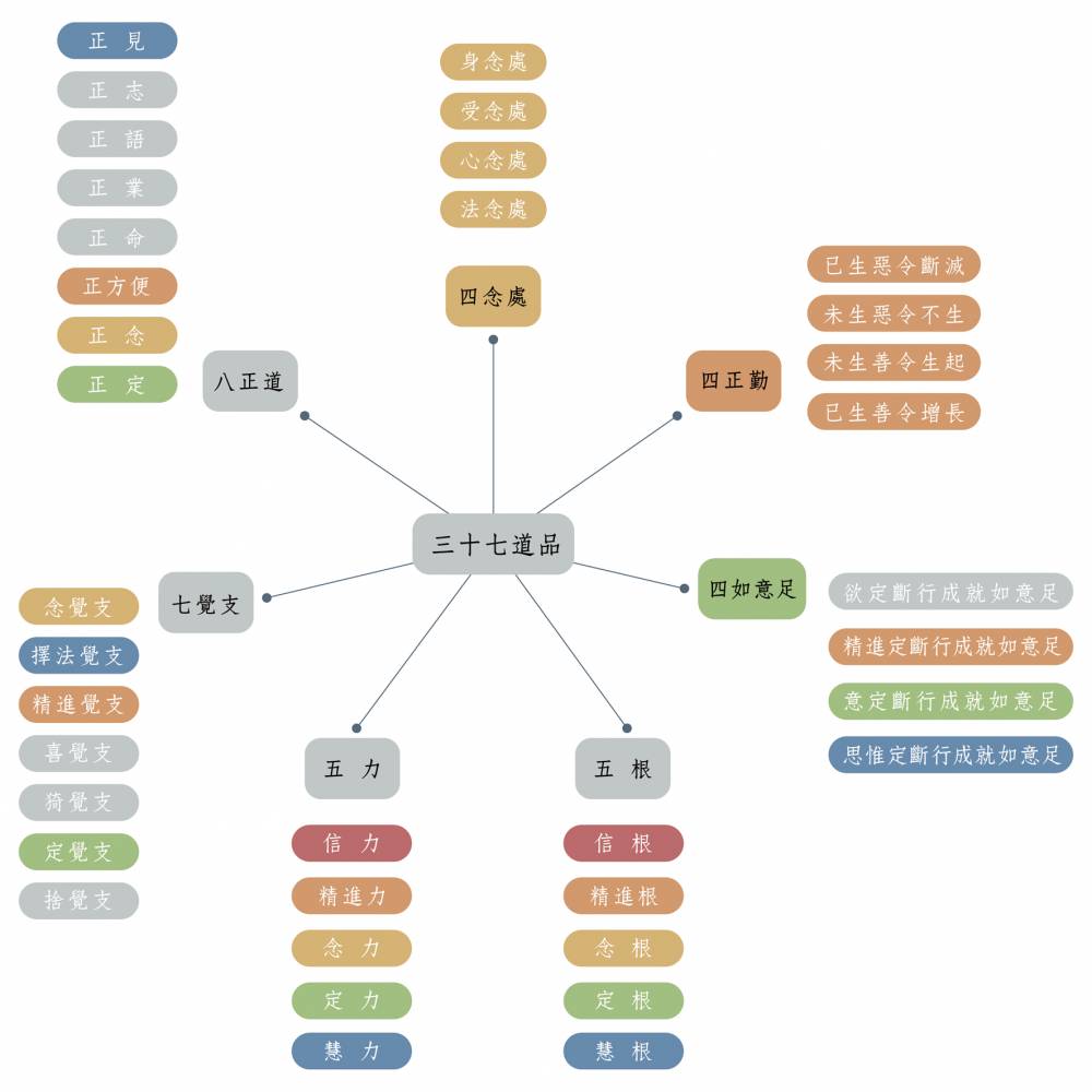 [導讀:三十七道品]要快速證悟並除滅煩惱,可以整理出三十七類通往涅槃的方法,稱為「三十七道品」,包括:
