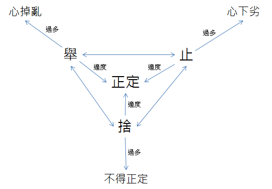 ◎伽摩比丘答質多羅長者:「出息、入息名為身行。有覺、有觀名為口行。想、思名為意行。」(《雜阿含經》卷二十一第568經) ◎「四禪以入息出息為刺」,表示三禪之前都有「身行」?(《中阿含、卷二十一(八四)長壽王品無刺經第十三》) ◎「入想知滅定者以想知為刺」,表示「想知滅定」之前都有想?而「想知滅定」已經是阿羅漢境界(盡諸有漏)的滅盡定了。(《中阿含、卷二十一、(八四)長壽王品無刺經第十三》) ◎ 而四禪之內,都是有想的(《雜阿含經》卷二十一第559經),所以這表示四禪之內也還是有伽摩比丘對質多羅長者所說的「行」? [進階辨正](一二四七)[0342a03]如是我聞: 一時,佛住王舍城迦蘭陀竹園。 爾時,世尊告諸比丘:「應當專心方便,隨時思惟三相。隨時思惟三相,不偏其中一相云何為三?隨時思惟ⓐ止相,隨時思惟舉相,隨時思惟捨相。若比丘一向思惟止相,則於是處其心下劣。若復一向思惟舉相,則於是處掉亂心起,若復一向思惟捨相,則於是處不得正定,盡諸有漏。 「以彼比丘隨時思惟止相,隨時思惟舉相,隨時思惟捨相故,心則正定,盡諸有漏。如巧金師、金師弟子以生金著於爐中增火,隨時扇韛ⓑ①,隨時水灑,隨時俱捨。若一向鼓韛[*]者,即於是處生金焦盡。一向水灑,則於是處,生金堅強。若一向俱捨,則於是處生金不熟,則無所用。是故,巧金師、金師弟子於彼生金隨時鼓韛[*],隨時水灑,隨時兩捨。如是生金,得等調適,隨事所用。如是,比丘!專心方便,時時思惟,憶念三相,乃至漏盡。」 佛說是經已,諸比丘聞佛所說,歡喜奉行。 [校勘]ⓐ 「隨時思惟」,宋、元、明三本作「思惟隨時」。 ⓑ 「韛」,明本作「鞴」。[*] [註解]① 扇韛:以風箱吹風。「韛」是古代用來鼓風吹火的皮囊,俗稱風箱,讀音同「拜」。 [對應經典][讀經拾得]本經講說如何調整以讓心達到正定的方法,隨時思惟的三相如下圖所示: 《長阿含經》卷八第9經眾集經也有提到這三相:「復有三法,謂三相:止息相、精勤相、捨相。」(CBETA, T01, no. 1, p. 50, b2-3) 只去修行「止」不加作意,則不行於道,其行不得成就;只修「舉」,不加觀察,燥動前進,離於經軌,其行不得成就;只修「捨」於動靜間無有作用,其行不得成就。