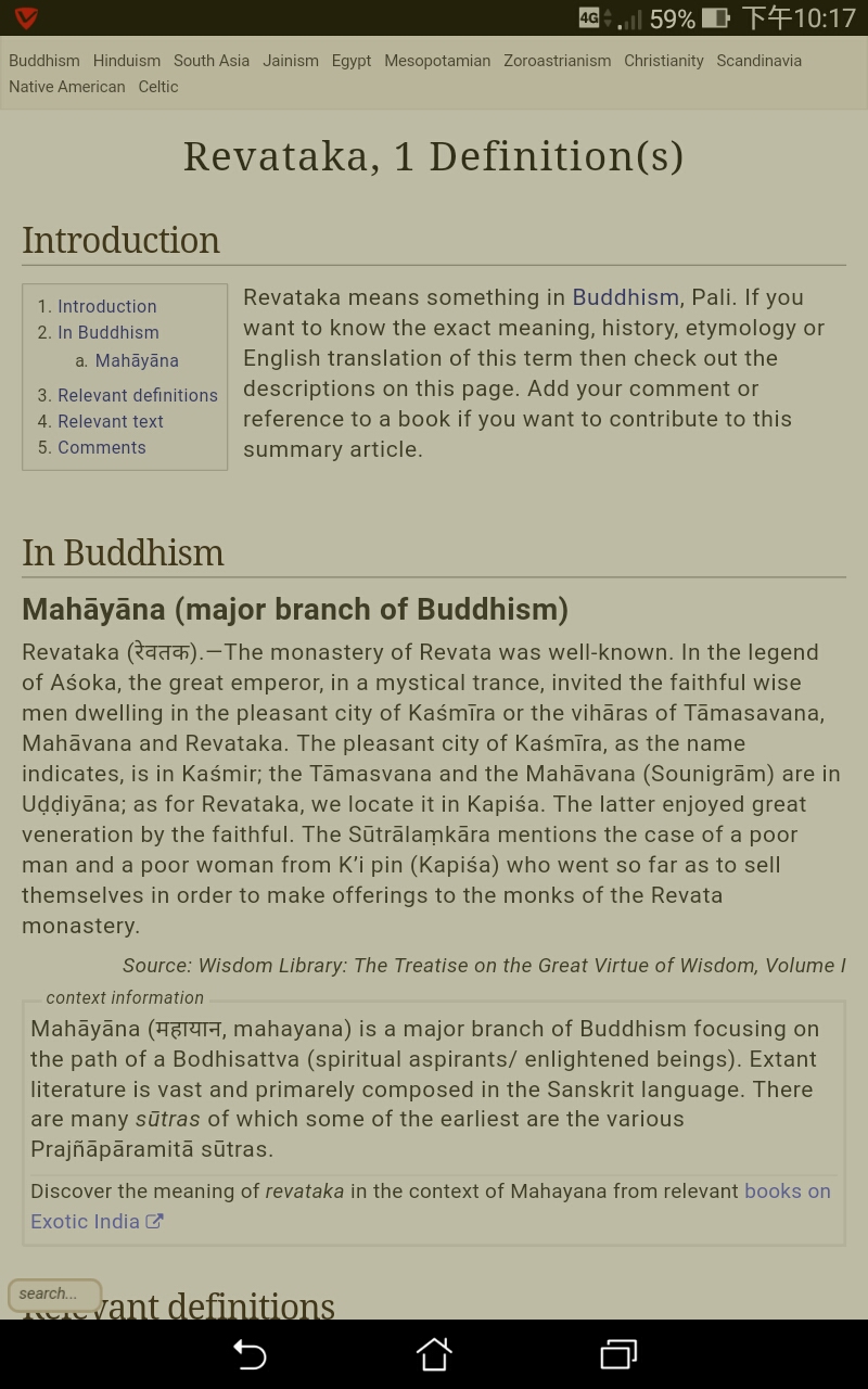 多波婆屬於至那僕底國(參見西域記卷四),即今拜亞斯河(Bias)與索特來治河(Sutlej)會流處以南一帶: 「大林」是一大片森林,當中有重閣講堂,可能也有其他建築,不過我沒印象有叫離婆多或離越一類的(不排除可能性,畢竟這經已是在阿育王時代之後所記的,那時佛教可能已多了不少建築)。 我這樣乍看之下,這些老外似乎都是照漢譯的去推敲,不知道有沒有照《Divyāvadāna, p.366-405》去推敲的?有辦法找到《Divyāvadāna, p.366-405》那一段寫什麼嗎?從《Divyāvadāna, p.366-405》和漢譯取交集,是註解上比較保險的(沒有辦法中的)辦法。 Anderson Chang: 尷尬了,一查 Divyāvadāna這個字,竟是deva vada = 天界所述。是說一切有部律中傳出,本文還是梵文。在巴利藏中找不到相關資料。 The Divyāvadāna or “Divine narratives” is a Sanskrit anthology of Buddhist tales, many originating in Mūlasarvāstivādin vinaya 說一切有部律 texts.[1] It may be dated to 2nd century CE. The stories themselves are therefore quite ancient[2] and may be among the first Buddhist texts ever committed to writing, but this particular collection of them is not attested prior to the seventeenth century.[3] Typically, the stories involve the Buddha explaining to a group of disciples how a particular individual, through actions in a previous life, came to have a particular karmic result in the present.[3] A predominant theme is the vast merit (puṇya) accrued from making offerings to enlightened beings or at stupas and other holy sites related to the Buddha.[3] 可以看看這兩個來源,實是梵文: https://www.wisdompubs.org/sites/default/files/preview/Divine%20Stories%20Book%20Preview_0.pdf https://www.ancient-buddhist-texts.net/Reference/Early-Buddhist-Texts/Early-Buddhist-Texts.pdf 然後我換個方向找,在巴利資料中以阿育王Asoka為關鍵字查找,竟然就只有他的年青、生平、歸化佛教、送兒女出家及派遣高僧到四方傳教。 http://www.palikanon.com/english/pali_names/ay/asoka.htm 也沒長眉尊者Pindola Bharadvaja和阿育王互動的資料,似乎這件事在南傳部派中是沒留下記載的。 難怪老外的英譯看起來這麼熟悉XD David Chiou: 哈,原來如此。所以搞不好這些英譯大多是依據漢譯…
