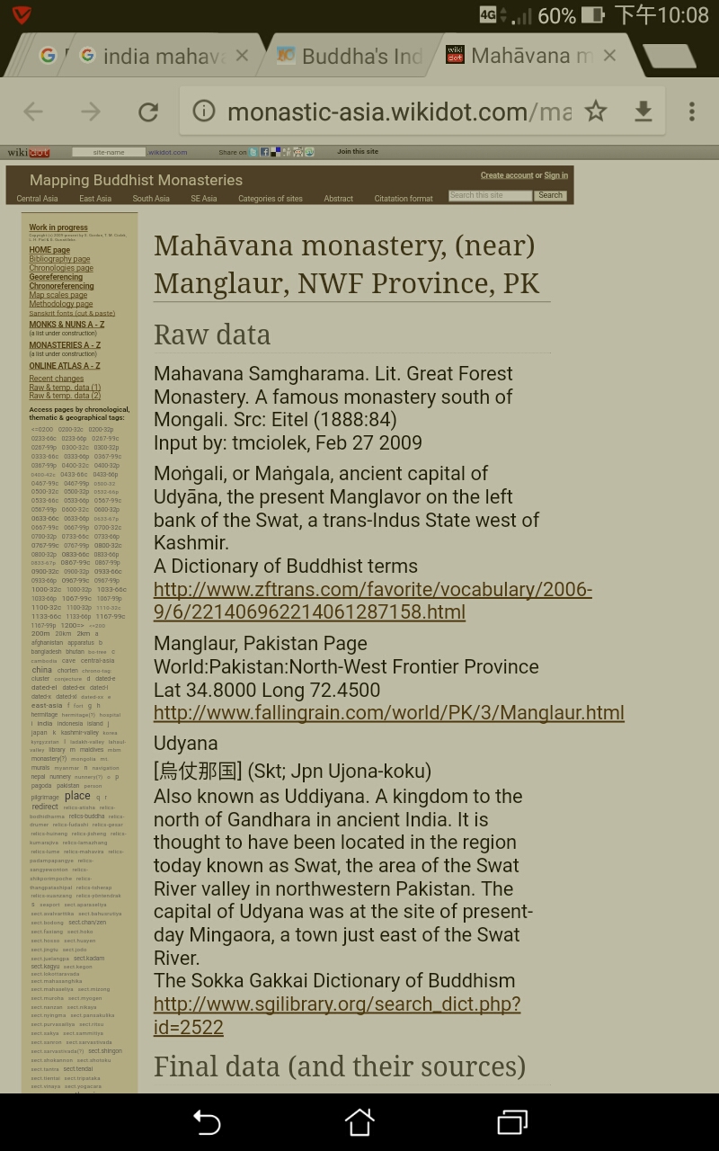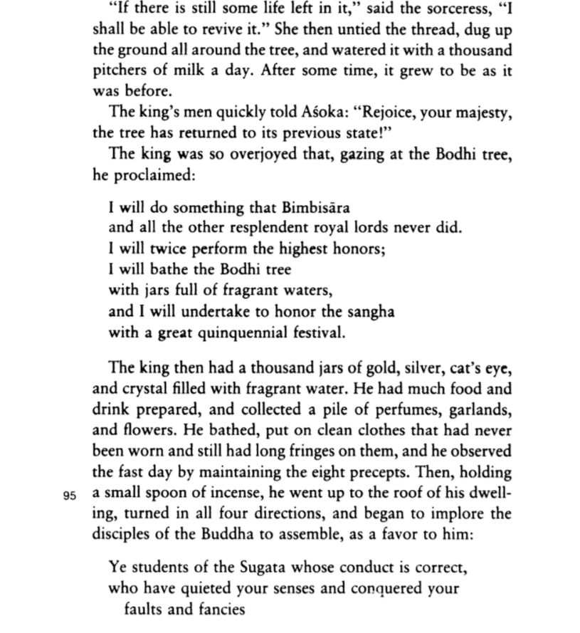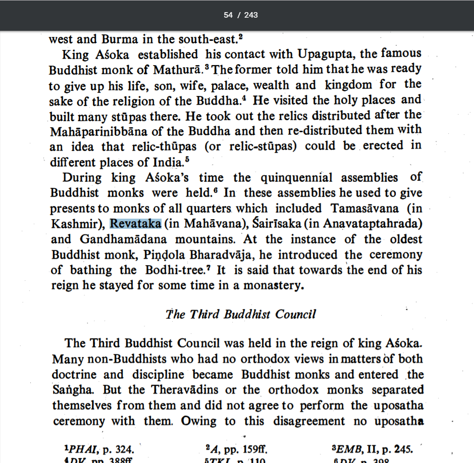 諸聖在處處, 罽賓🄽㋐多波婆🄾㋑ 老外的資料略有出入,但顯然不是寺院就是地名。 大林mahavana 跟revataka 應該是兩個不同的地方。 我再繼續找找看。 David Chiou: 謝謝! 大林精舍很常見,就是重閣講堂。不過我也不確定是不是這邊的大林就是指大林精舍,因為大林本身也能指很大的林,而且大林精舍的地點(在中印度)離北印罽賓有一段距離,因此只能註解為「可能為大林精舍」了。 Anderson Chang: 第一位老外認為,阿育王無遮大會邀請的是「四方」僧,故用all quarter這個詞。
