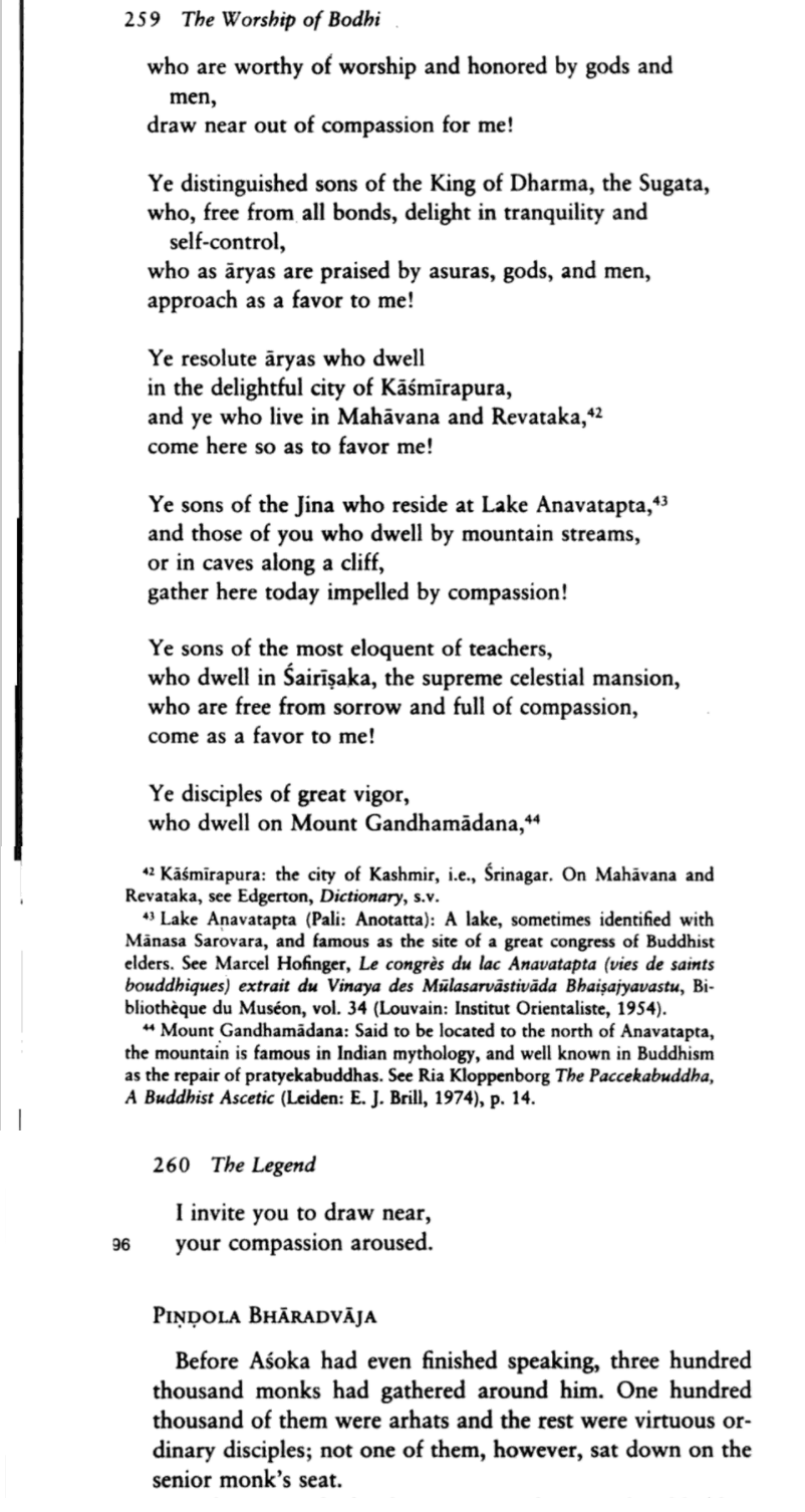 The Legend of King Aśoka: A Study and Translation of the Aśokāvadāna 第二份資料就完全不提方位、四方的關係。 阿育王迎請聖眾應供,一講完就出現 30萬僧眾 ,其中10萬是阿羅漢聖僧。 所以這些地方似乎就是各個有賢聖僧眾隱居的地方,彼此間距離很遠也是蠻正常的。 甚至就實際上來說,那些地方也僅是一個大略的門戶入口,賢聖僧處在另一個空間,平常人看不到也進不去的。 回到文本來看,當時離佛世仍未久遠,聖者隱居在哪邊都還有線索。